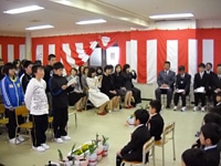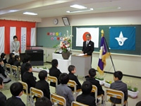 来賓の沼崎町長は、子どもたちには「みんなと仲良くして、楽しく学んで欲しい」と話し、保護者には「文部科学省に協力を頂いて船越小学校を1日でも早く再建したいと思っています。この厳しい環境の中でこそ強い子を育てて欲しい」と、祝辞を述べました。
