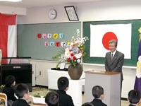入学式には、山田町町長の沼崎喜一氏や他の来賓方々、また大勢の父母も出席しました。佐々木道雄校長は新1年生を笑顔で迎え、式辞を述べました。「1年生の皆さんには先ず二人の先生の名前を覚えて欲しいと思います。一人目は皆さんの担任の佐々木文子先生、そして二人目は佐々木道雄校長先生です。」それでは大きな声で二人の先生の名前を言いましょうと、1年生のみんなと大きな声で二人の先生の名前を言いました。大きな声で二人の先生の名を呼び子どもたちの緊張を解いた後、三つの約束について話をされました。一つ目の約束は、交通事故に合わないように気を付けよう、2つ目は、自分の事は自分でしよう、3つ目は、友だちと仲良くしよう。この3つの約束を守り楽しい学校生活を送って下さいとの挨拶がされました。