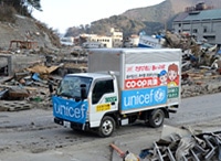 震災直後の被災地は物流インフラも大きな被害を受け、ガソリンの調達も非常に難しい状況でした。被災地まで物資を運ぶトラックや被災地近郊の物流拠点となる倉庫、そして、その拠点から各被災地へのトラックの確保が難航をきたす中、30年以上にわたってユニセフの活動を広報・募金の両面で支えてくださっている宮城と岩手両県の生活協同組合が、地域に根ざしたネットーワークをフルに活用して当協会の緊急救援物資を避難所に配送。被災者の方々へのいち早い支援を可能としました。