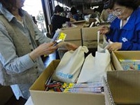 | 文房具の梱包作業にあたる広島、岡山、香川、愛媛各県から駆けつけたボランティアの皆さん | 岩手県の高田小学校に届けられた支援物資を受け取る女の子。 | 気仙沼の大島児童館に届けられたちっちゃな図書館。フェリーから児童館まで、本を担いで徒歩で運んでくださいました。 |