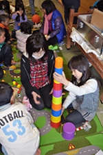 子どもたちのストレスを可能な限り緩和して、心の問題となるのを予防する目的で避難所などに設営された「子どもに優しい空間」。コペンハーゲンにあるユニセフ物資供給センターに備蓄されていた「箱の中の幼稚園」や「レクリエーションキット」といった「子どもに優しい空間」活動に必要なツールは、日本航空の無償協力によって、迅速に空輸されました。