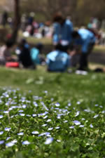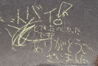 お絵描きスペースでのこと。ある男の子は、何本ものチョークを使って、長い線を描き、線の両端に丸を描いて、その丸に点を二つと線を描きいれて「へび」と言い「食べられる、にげろー」と他の遊び場に逃げて行きました。また、ある男の子は、ぐるりと大きな四角い形を描き、「バス」と言いました。バスの下にまっすぐな線を描いて、バス停を描き、まっすぐな線を少し伸ばして木を描き、また少し伸ばして家を描きと続けて、「町ができてきた」と言い、お父さんを呼んでその絵を見せて「ここに住もう」と父親を勇気づけるように話していました。また、ある女の子は、地面に二つ長細い丸を描き、その周りにダイヤの模様を描いて、「これを両脚で踏むとみんな幸せになる」と嬉しそうに言いました。他にもたくさんの絵が描かれて、広場はとてもきれいな色になっていました。子どもたちがさまざまな形で表現することの意味深さを感じて感動すると同時に、抱えているたくさんのものを、安心して表現できる環境を整えることが大切であることを強く感じました。たくさんのボランティアの方が子どものお絵かきを応援している姿があり、子どもたちが安心して取り組めていたように感じました。