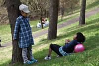遊び場を移動しているときに、遊び場に背を向けて座っている女の子が見えたので、隣に座らせてもらうと、しくしくと涙を流しました。「涙がでるんだね」とそっと座っていると、私の顔をみて「さみしい」と小さな声で言い、そこでそっと過ごしました。しばらくすると、少しずつ遊び場の方に身体を向けて、笑顔を私に見せてくれるようになりました。動物のえさやりができる場所に行くと、「怖い、怖い」といいながらもやぎとうさぎのえさやりに挑戦し、『怖い。でも大丈夫だ』という体験から気持ちの調整をしているようでした。ユニセフスタッフの方にも、そのことを見守ってもらうことができ、次第に体の緊張もほぐれて、自然な笑顔で違う遊び場に向かい、他のスタッフと遊ぶことができていました。自分をコントロールする力がある子どもでも、安心感を失っていることが感じられ、遊びを始めることにはたくさんのエネルギーを必要としていることを感じました。