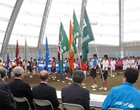 7月22日に行われた開会式では、宮城県中学校体育連盟の櫻井健二会長より「被災地域では、校舎や校庭が使えなくなったり、用具が流されてしまったりという状況の中で、それぞれが練習場所を探したり、用具を貸しあったりしながら、今日の大会を迎えることができました。みなさんが困難を乗り越えていく姿は、自身の大きな力になったと思いますし、たくさんの人に勇気と希望を与えました。また、みなさんを応援してくれる人もたくさんいました。家族や多くの仲間の気持ちを大切にし、精一杯頑張ってほしいと思います。この震災で人間として1回りも2回りも成長し、将来に向けて活躍することを祈っています。また、今回、日本ユニセフ協会からは交通費、宿泊費ほか多大な支援をしていただき、本当に感謝しています」と、挨拶がありました。