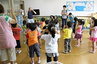 年中、年長組24人が待つ教室に到着すると、明るいあいさつで迎えてくれました。アルナルさんからの「アイスランドを知っていますか?」という問いかけに、「アイスが食べられる国?」といっていた子どもたちは、まだ知らない外国の話に夢中になっていました。日本から遠く離れた場所ですが、日本と同じ島国で、魚をたくさん食べること、温泉があることなど、日本と似た点があるのを聞いて、とても驚いていました。マジックも飛び出すアルナルさんのお話を一生懸命聞き、アイスランドの風景や動物の写真も身を乗り出して見ていました。そして、“あたま・かた・ひざ・ポン”の歌を振り付けも合わせてアイスランド語で歌いました。
