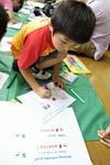 アイスランドのお友達から届いた手紙に今度はみんなでお返事を書きました。アイスランドの国旗の絵を描いたり、折り紙を使って動物を作ったり、アイスランド語でTakk(ありがとう)と書いている子もいました。お返事用のポストに、完成した手紙をみんなで順番にいれました。また、お返事と一緒に、新聞紙でかぶとを折り、アイスランドのお友達へのプレゼントにしました。