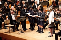 | 11月23日、「TDKオーケストラコンサート2011」の冒頭、第1コンサートマスターの樫本大進氏から『ソリダリティ・ブック』を受け取る宮城県農業高校と宮城県亘理高校の生徒たち。 |