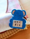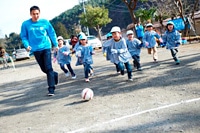 | 園の先生方が用意してくださったエプロンと名札。 | 子どもたちに紙芝居を披露する「長谷部先生」。 | 「長谷部先生」とサッカーをする子どもたち。 |