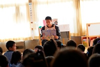 贈呈式に先立ち、長谷部さんは、公民館を仮園舎として保育を再開しているあさひ幼稚園の子どもたちを訪問。園が用意したエプロン姿の「長谷部先生」は、約40名の子どもたちを相手に紙芝居の読み聞かせやサッカー教室で大活躍。サッカーボール20個とサイン入りポストカードのプレゼントに、子どもたちからは、歌と大きな画用紙に書かれたお手紙がプレゼントされました。