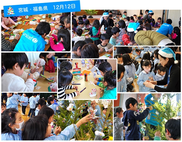 ユニセフサンタが訪れた園以外にも17の幼稚園や保育園、そして、埼玉県や神奈川県に避難し生活している福島の子どもたちのクリスマス会4箇所にツリー、そして2000人が参加し制作したオーナメントが届けられました。