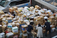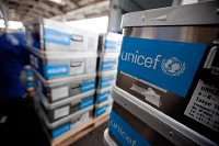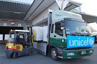 3月19日、ユニセフの支援物資第1便として飲料20トンが宮城県に到着し、その後も水、紙おむつ、お尻ふき、子ども用肌着、靴、玩具などを国内の支援企業やユニセフ物資供給センターの協力を得て調達。長年にわたるユニセフのパートナーであり、既に被災各地の避難所などへの物流ルートを確立していた被災地の生活協同組合等の協力によって、迅速に輸送・配布することできました。