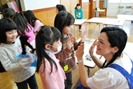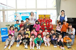 渡利幼稚園のみんなが待つお部屋に民族衣装を着たお二人が入ると、子どもたちの「わー!」という歓声があがりました。まず、ヘレンさんからウクライナについてのお話です。ウクライナの民族音楽がかかると、お部屋はまるで、ウクライナに来たような雰囲気に包まれました。ウクライナの場所について地図で確認した後、ヘレンさんがみんなに見せたのはおいしそうなスープの写真。子どもたちは口々に「美味しそう!食べたい!」と声を上げました。ヘレンさんは、「このスープは何で出来ているのかな」と尋ね、スープに使われている野菜を実際に見せてくれました。「じゃがいもみたい!」と子どもたち。でも、二つに切ってみると中味は真っ赤です。これは、ビーツという赤カブの一種だそうで、あまり親しみのない野菜に子どもたちは興味津々な様子でした。その後も、お客さまが来た際、パンを差し出す時に使うクロスや、ウクライナ伝統工芸の卵細工「ピサンカ」も見せてくれました。