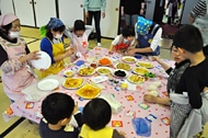 学生のみなさんが準備していた栄養や食事に関する紙しばいをみたり、お友だちと一緒に遊んだりして待っていた子どもたち。色とりどりのお料理ができあがって運ばれてくると歓声があがりました。