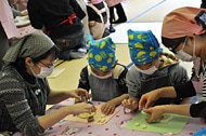 最初の下ごしらえには子どもたちも参加。型をつかって大根やこんにゃくなどの材料を小さく切って準備しました。その後はおとなのみなさんが調理室に移動して和気藹々と調理を行いました。