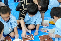 この支援プロジェクトの一環として、このたび隣接する幼稚園に通う子どもたちと保護者の方々に「子育て支援センター」の玄関周囲を“お迎えの壁”にするための装飾ブロックづくりに参加していただくワークショップを開催しました。