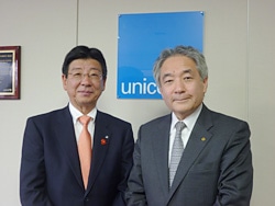 | ユニセフハウスにて。左 佐藤仁南三陸町長 右 早水日本ユニセフ協会専務理事 |