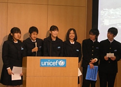 女川町は、宮城県沿岸部に位置する、養殖漁業や水産加工業が盛んな美しい町です。しかし大地震とその後襲った大津波により、800人もの尊いいのちが失われ、家屋の9割近くが被害を受けました。この日ユニセフハウスを訪問した8名の生徒さんは、震災当時小学校6年生でした。震災から1ヶ月後の4月11日に中学校の入学式を迎えた彼らは、「制服も、文房具もありませんでした。けれど、学校生活に必要なもの、生活に必要なもの、生きていくために必要な支援と善意を、ユニセフをはじめ、たくさんの方々からいただきました。だから、私たちも自分たちに出来ることに取り組んでいきたいと思いました」と語り始めました。