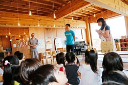 今回、約1年ぶりとなる訪問は、新園舎完成後初めての訪問です。子どもたちが安心する空間となり、元気に過ごしている園舎に入ると、「長谷部選手、お帰りなさい!」子どもたちの明るく大きな声に出迎えられました。あさひ幼稚園の園舎には、町内のお寺「大雄寺」の参道に植えられていた樹齢300年にもなる杉の大木が使われています。この杉も津波に飲まれ、塩害で立ち枯れる運命にありましたが、南三陸の命を伝える木として園舎に生まれ変わり、子どもたちを守っています。