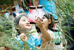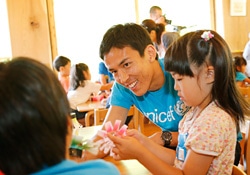 | 元気いっぱいの子どもたちがお出迎え。 | 七夕の準備をする子どもたちに長谷部選手も合流。 |