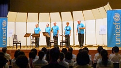 この後、支援への感謝の気持ちをこめて合唱曲「ほら、教室は宇宙だ」、「ふるさと」、「ずいずいずっころばし」の3曲と、全校生徒による「校歌」が披露されました。心の中で手と手をとりあって高らかに歌い上げる希望に満ちた歌声に、木管五重奏団のメンバーは「子どもたちからエネルギーを与えられた」と大きな拍手とエールを送りました。