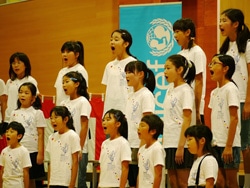 | 「手と手をつないでくちずさむ、山も風も海の色もここはふるさと、きみのふるさと、僕のふるさと」4〜6年生による嵐の「ふるさと」が新しい体育館いっぱい、高らかに歌い上げられた。 |