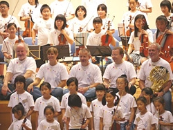 | 「相馬子どもオーケストラ」の週末弦楽器教室。メンバーは飛び入り参加で子どもたちと演奏をあわせた。約1月半前にヴァイオリンを始めたばかりの4〜12歳までの子どもも含まれる。 |