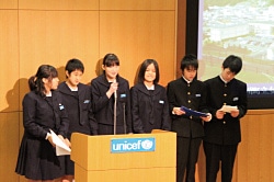 | 2013年4月にユニセフハウスを訪問し、生徒たち自身で考えた「1000年後まで伝える津波対策」について発表する宮城県女川町立女川中学校の生徒たち |