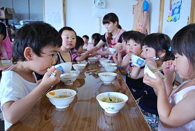 給食を食べる吉里吉里保育園(大槌町)の園児たち。