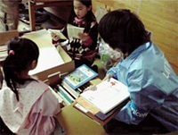 | Children receiving picture books, kami shibai and other items at a shelter set up at Aoba Junior High School in Ishinomaki City on 4 April. |