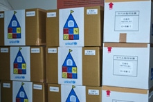 | People delivering kami shibai and other books to the UNICEF House. | Picture books and children’s books ready for shipment from the UNICEF House. |