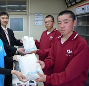 | Osanai Junior High School Student Body President Ishizaki and Vice-President Ogura. Ishizaki comments, “We will treasure these supplies.” Then, the children blush as the principal jokingly reminded the students of the start of mid-term exams the following day, in saying, “Now you can study, right?” |