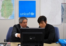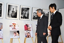 | On his way out, Mr. Lee viewed “Happy Birthday 3.11”, a photo exhibit on display on the first floor of the UNICEF House that introduces photos of children born in the disaster areas on 11 March 2011. | JCU Executive Director Ken Hayami provides a report of assistance activities to Mr. Lee. |