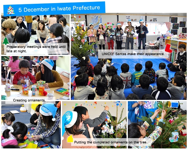 More than 975 children participated in ornament making activities and over 100 volunteers served as UNICEF Santas. This Christmas children affected by the Great East Japan Earthquake received ornaments created for the special purpose of ensuring that they enjoy the holidays, and were even given the opportunity to try making ornaments themselves.