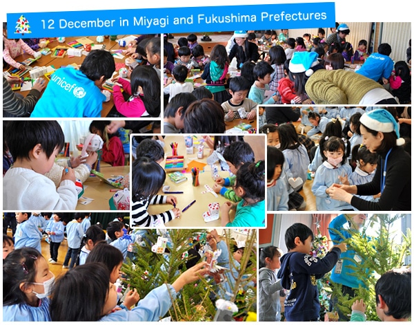 On two separate occasions, 5 December and 12 December, volunteers, project staff and Japan Committee for UNICEF (JCU) staff donned in blue Santa hats acted as “UNICEF Santas” and visited a total of 15 preschools, kindergartens and other locations in Iwate, Miyagi and Fukushima Prefectures.
