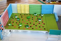 | One group created this library room. Half is covered in artificial grass and decorated with cushions. There is a special storage area beneath the grass. |