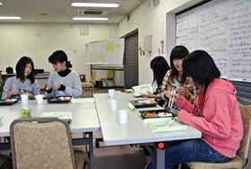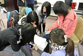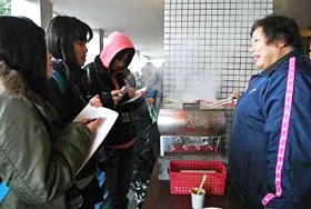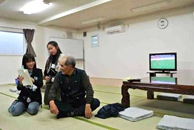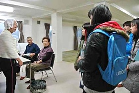 午後は両チームとも、大野台の仮設住宅の一角に設けられた公共浴場もある集会所を訪れました。普段は一日90人くらいのお客さんがいるとのことですが、雨ということもあり、この日はいつもより少なめとのことでした。お風呂に入りに来ていたお年よりたちが子どもたちの取材に答えてくれました。