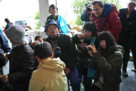 朝市の方が、集まっているみなさんにこのEYE SEE プロジェクトと写真を撮っている子どもたちを紹介してくださいました。 |