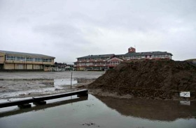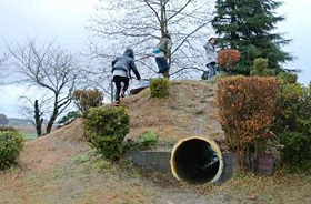 ワークショップ会場に戻る帰り道、愛叶さんの通う大野小学校に立ち寄りました。除染で掘り返された土が盛られている校庭。校舎も東側半分は地震の影響で地盤沈下となり、現在は使用禁止になっているそうです。いずれ校庭に仮設をたてて、立て直しの工事が始まるとのこと。