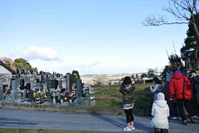 最初に向かったのは磯部。墓地がありました。高台から、松川浦一体を見渡すことができます。戦没者慰霊碑と眼下に広がる何もかもが失われた一帯のようすに、戦争や災害で人が亡くなることに思いを馳せている参加者もいたようです。