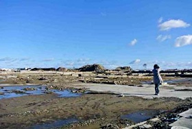 地盤沈下した地面。雨の日や満潮時には海の水が道路を覆うとのこと。このあたり一体は住宅地だったそうですが、今は家の土台しか残っていません。なにもない、広大な平野を強い海風が吹き抜けて行きます。