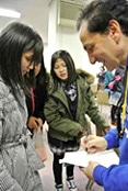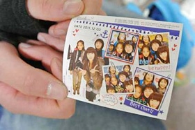 仮設住宅に来ていたプリクラ・トラックで写真を撮ったというチームBのメンバー。プリクラできらきらした写真を撮ることがとても楽しいとのこと。 |