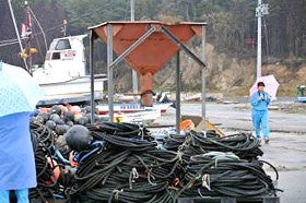 「いつもこのロープにワカメの種を付けます。今年は全部流されちゃったんで厳しいんじゃないかな」と話す敦也君。友だちのお父さんに漁師さんがいるそうですが、震災後に特に話は聞いたことはないとのこと。「漁師さんの話を聞いてみる?」と尋ねると、「そういう話を聞くのは、難しいんじゃないかな・・・」と答えました。