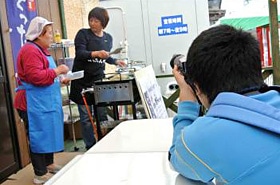 チームBは、吉里吉里の町の中心部にできた仮設の復興食堂「よってったんせぇ」で働く女性たちを撮影に訪れました。「よってったんせぇ」は大槌町の女性漁労者らでつくるマリンマザーズきりきりのメンバーによって運営されています。この場所は「魚市場で働いていた漁師の奥さんたちが、復興に向けて頑張っている姿を撮りたい」と子どもたちがどうしても訪れたいと思っていた場所のひとつでした。地元の漁業復興を後押ししたいと、震災後にフランス料理のシェフによって考案された新名物「吉里吉里鮭子(おやこ)焼きそば」には、サケとイクラをメインに、ワカメの入った麺や宮古市産の塩など地元の食材がふんだんに使われています。子どもたちは働く女性たちの姿を撮影し、熱心にメモを取っていました。