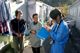 仮設住宅で住民のみなさんに写真を撮影しながらお話をうかがう