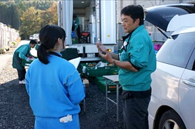 仮設住宅で定期的に移動店舗を開いているスーパーの方にこれまでのお話をうかがう |