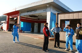 営業を再開したガソリンスタンドのご夫妻にお話をうかがう。その姿に「かっこいい」と感動していた。 |
