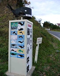 捕鯨で有名な鮎川。町中でクジラのイラストを見ることができます。小学校の看板にも。鮎川小学校の校庭には、現在仮設住宅が建てられています。遊ぶスペースも少なくなってしまいましたが、子どもたちは校舎脇に設置された遊具などを使って遊んでいます。