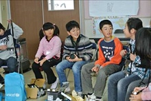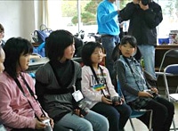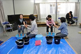 足湯とマッサージを受けながらボランティアの学生の話を聞く子どもたち。終了後は写真撮影 |