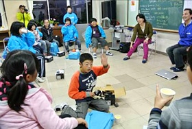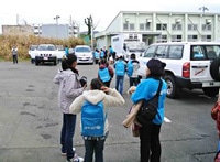 昨日受け取ったカメラを手に、朝から元気に集まってきた子どもたち。賑やかな一日のスタートです。この日の天気予報は晴れでしたが、教室でジャコモさんが子どもたちに一日の予定を説明している時に、通り雨が降りました。ワークショップの始まる前には小さな余震があり、震災はまだ完全におさまっていないことを実感します。