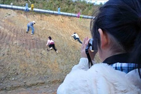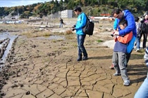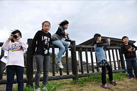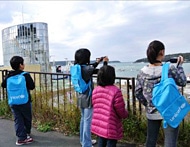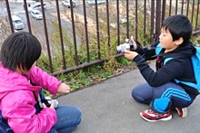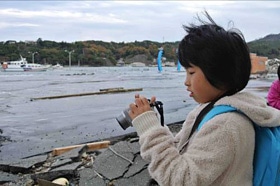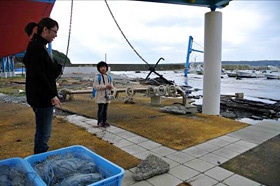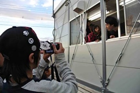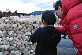 学校に戻って昼食を取った後、チームAのメンバーは、現在は瓦礫置き場となっている小渕浜の海岸を訪れました。ここにはカキの養殖に使うホタテの貝殻や浮子がたくさん置かれています。冷たい風の吹きつけるこの海岸で、子どもたちは寒さを忘れたようにはしゃぎながら思い思いの対象を撮影しました。